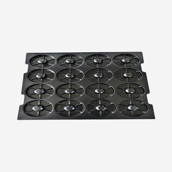 產(chǎn)品裝載皮帶輪,以圓形中間柱子定位皮帶輪,配套鐵料框使用,機械手吸盤直接吸取托盤。
